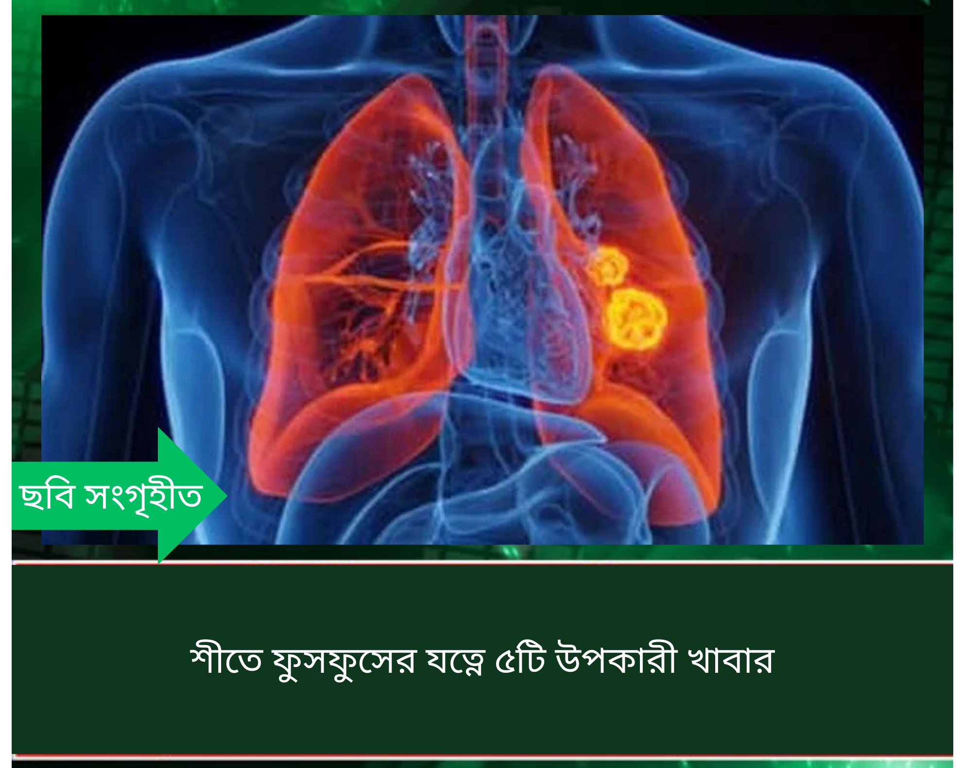 শীতকালে ফুসফুসের যত্ন বিশেষভাবে জরুরি। ধূলা, ধোঁয়া ও ঠাণ্ডা বাতাস ফুসফুসকে প্রভাবিত করতে পারে। কিছু খাবার ফুসফুসকে সুস্থ রাখতে এবং রোগ প্রতিরোধ ক্ষমতা বাড়াতে সাহায্য করে।