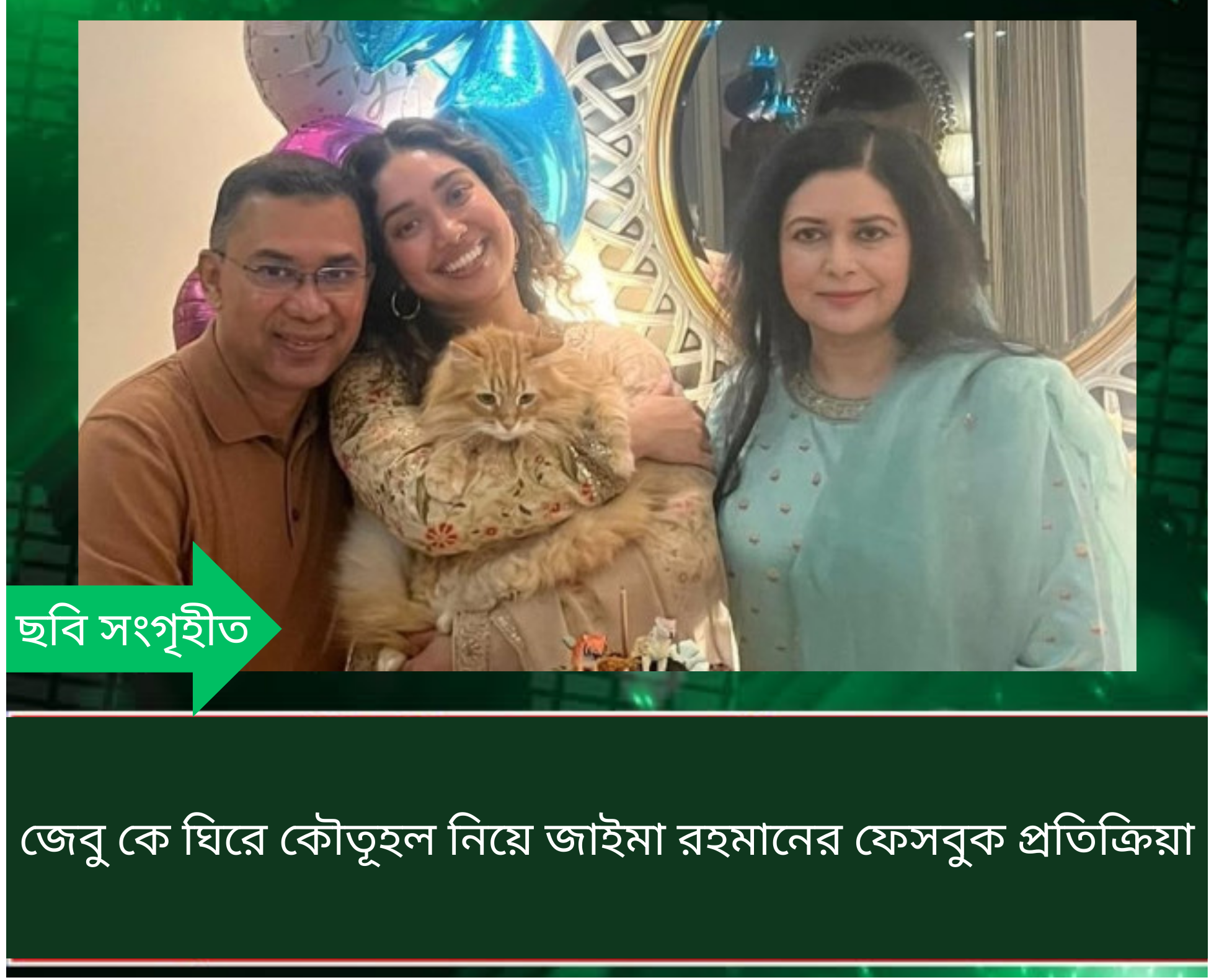 বিএনপি’র ভারপ্রাপ্ত চেয়ারম্যান তারেক রহমানের পরিবারের পোষা বিড়াল ‘জেবু’ সম্প্রতি সামাজিক যোগাযোগমাধ্যমে ব্যাপক আলোচনার জন্ম দিয়েছে। ভাইরাল হওয়া ছবির পর জেবুকে নিয়ে মানুষের আগ্রহ নজরে এসেছে তারেক রহমানের মেয়ে জাইমা রহমানেরও। এ নিয়ে তিনি নিজের ফেসবুক অ্যাকাউন্টে একটি আবেগঘন ও মজার স্ট্যাটাস দিয়েছেন।